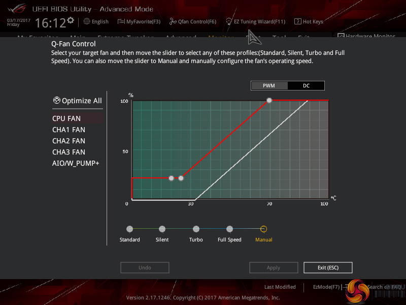 Hitting F6 loads up ASUS’ Q-Fan Control GUI which is a graphical method of adjusting the fan speed curve. Speed curves can be selected and configured for PWM and DC fans.