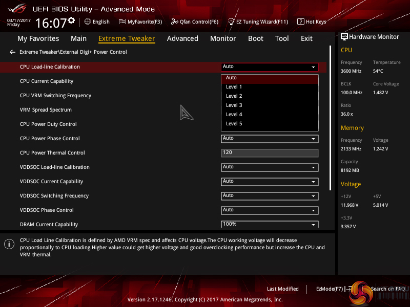 Load-line calibration (LLC) settings can be accessed through the External Digi+ Power Control page. ASUS provides options from level 1 to level 5 and gives a basic explanation of how LLC works. However, ASUS’ explanation of how voltage changes with load is not as good as MSI’s and ASRock’s visual interpretation using a graph. We had to resort to trial and error in order to find the desirable LLC level, which was a waste of time compared to competing vendors' solutions.