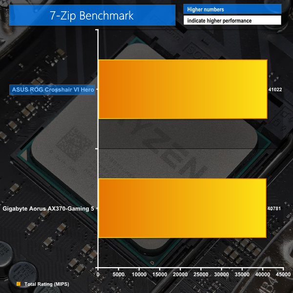 The Crosshair VI Hero is a little faster than Gigabyte's Gaming 5 in 7-Zip. The difference here is repeatable but it is minor at around 0.6%.