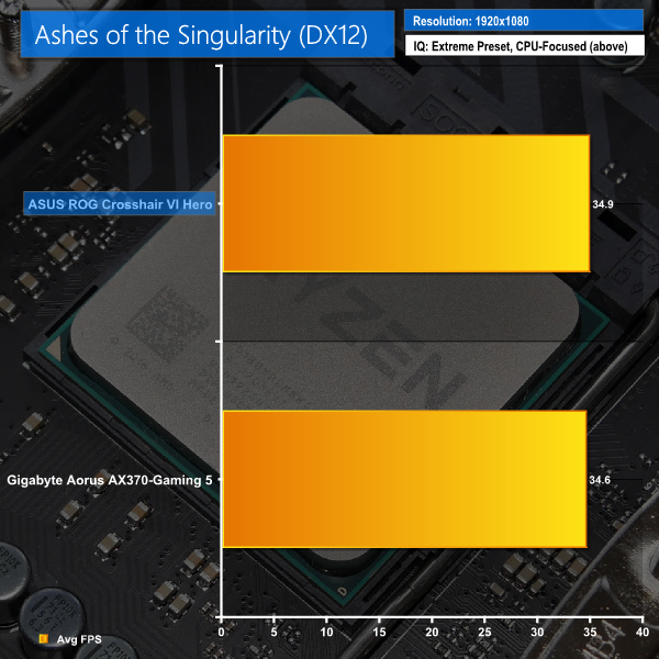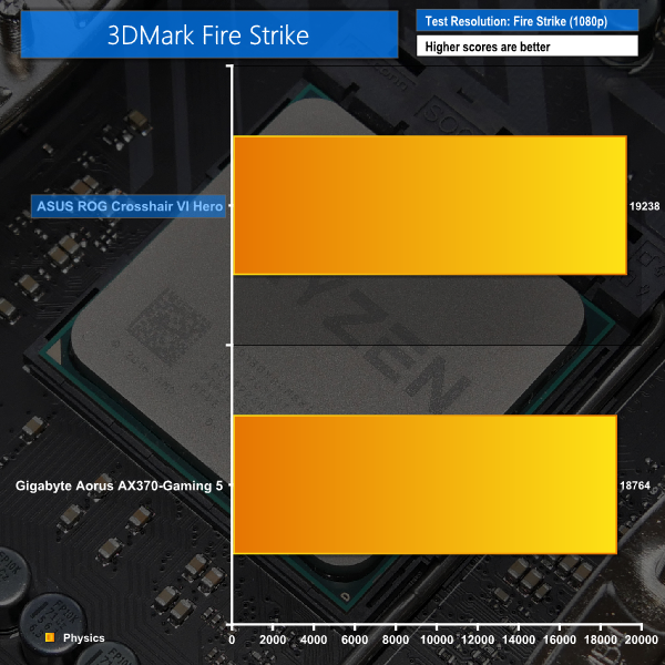 Gaming titles tend to be a little faster for ASUS' Crosshair VI Hero compared to Gigabyte's cheaper AX370-Gaming 5. GTA V rounds up to a higher average frame rate value while 3DMark Fire Strike scores nearly 500 points (around 2.5%) more on the ASUS motherboard.