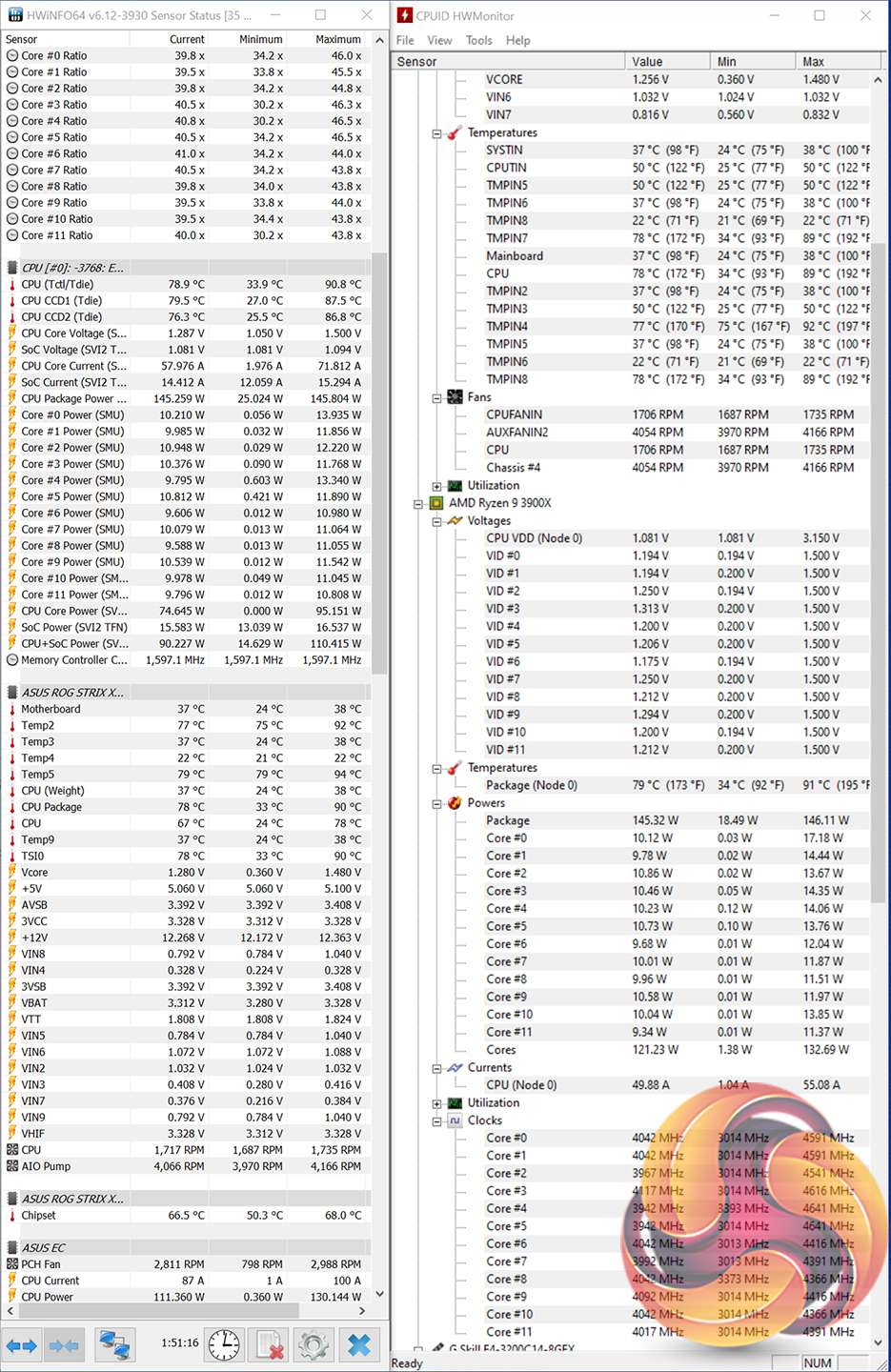 ASUS provides a solid set of temperature data points but it is disappointing to see the lack of a VRM temperature sensor. The power data according to HWiNFO and HWMonitor looks to be accurate.