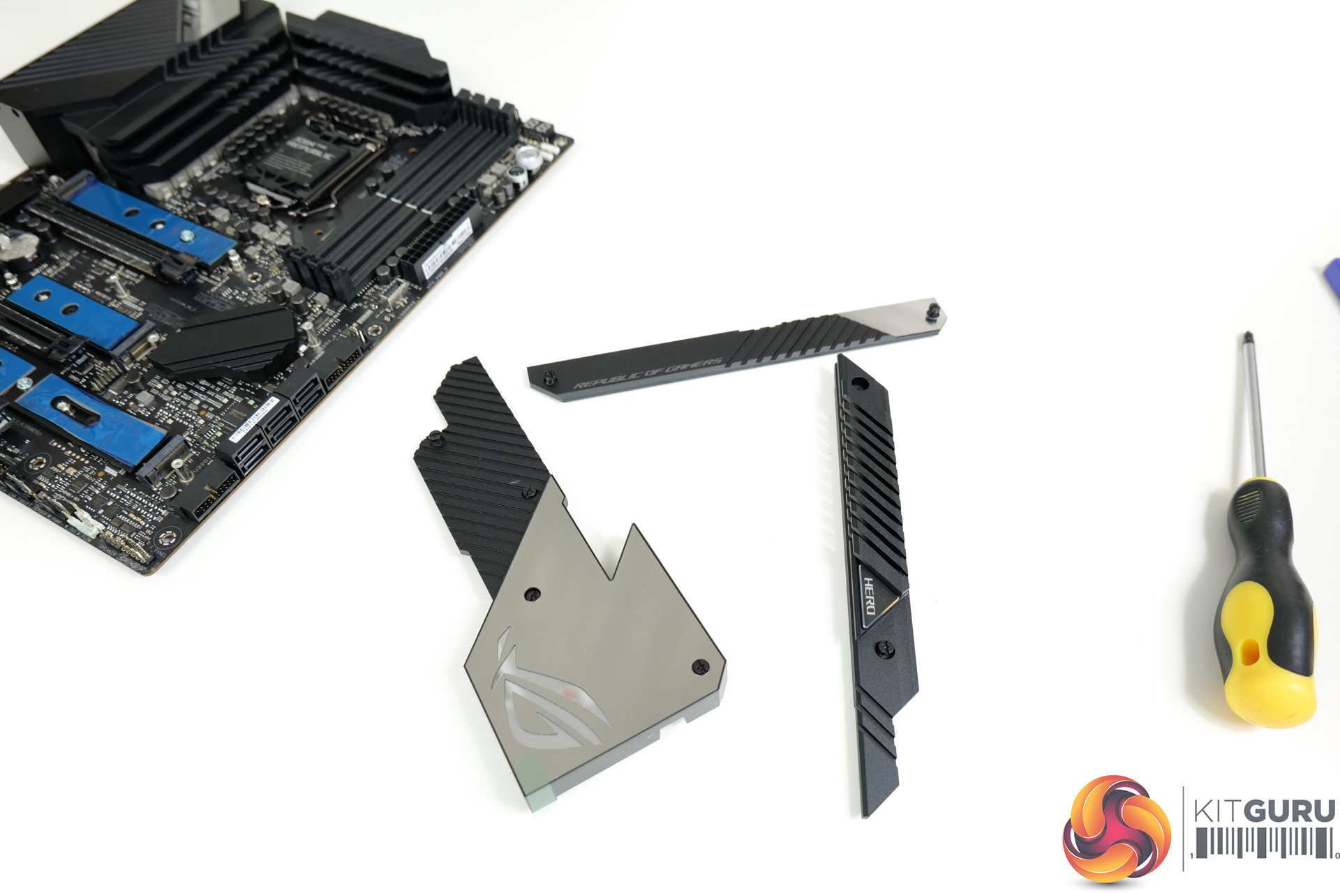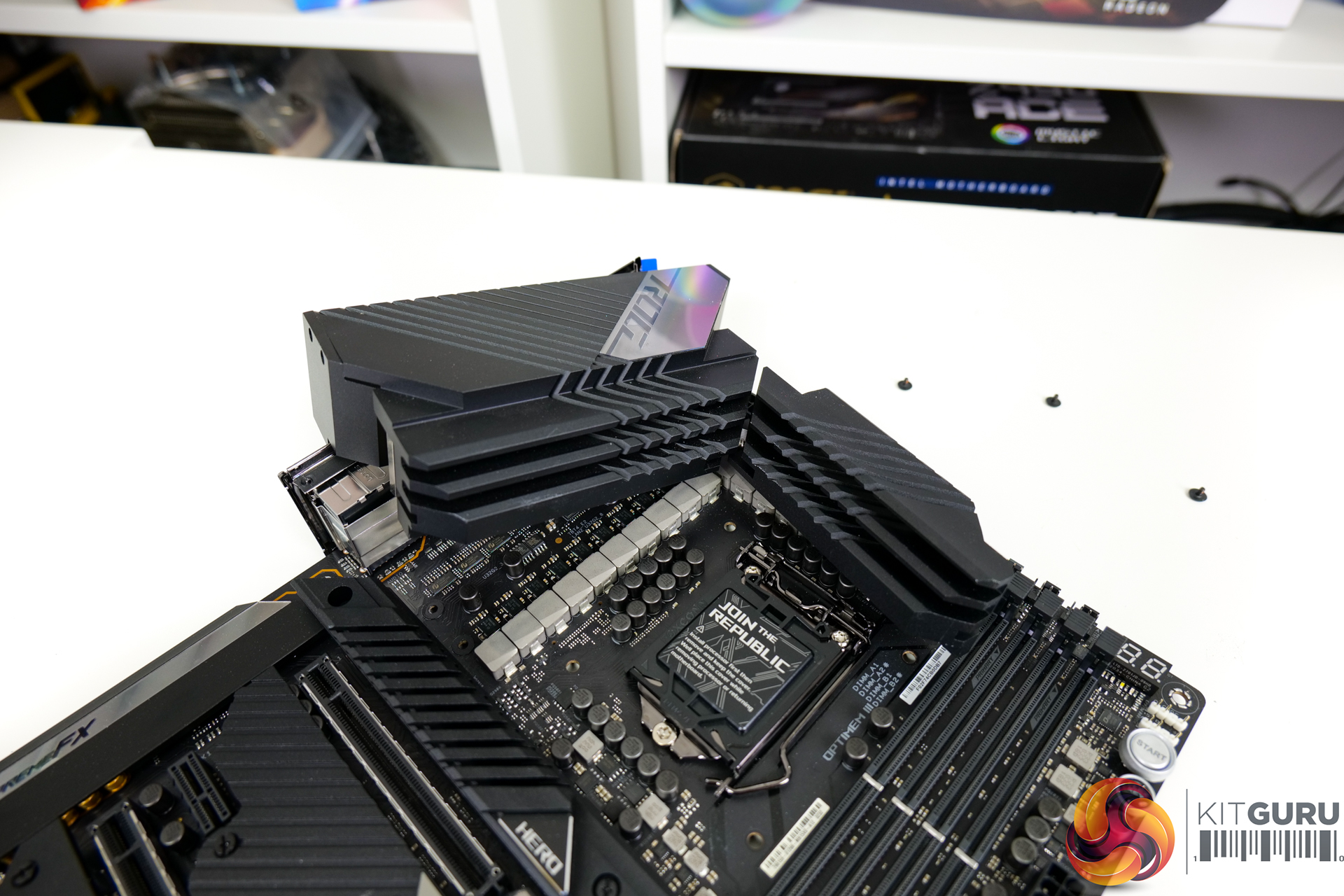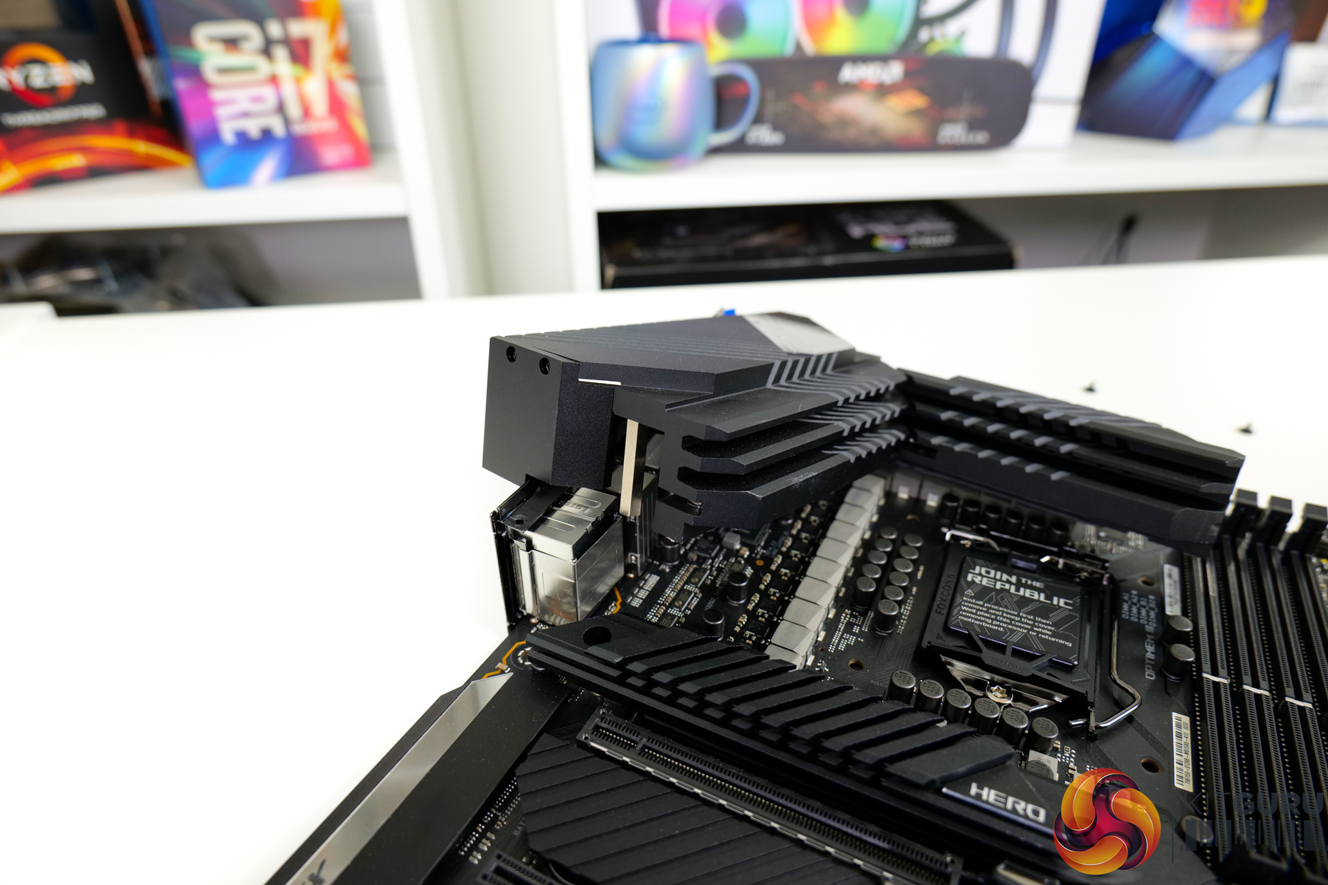 The M.2 heatsinks have also been beefed up slightly for the Hero. The top Gen 4 cooler features a multi-tiered slab of metal that should do a superb job. And the secondary slot’s heatsink branches out to the chipset RGB LED cover, giving it a little extra surface area … as well as a slightly more complicated installation procedure. No tool-less installation method like with the Z590-E Gaming WiFi is disappointing. The Hero does, however, offer dual-sided M.2 SSD cooling instead, so this is a clear functionality upgrade.