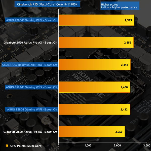 We see the same trend in Cinebench R23 whereby ASUS’ Z590 options score a little higher than the Gigabyte board that Leo tested when at stock. Adaptive Boost delivers a healthy performance gain for additional heat and power.