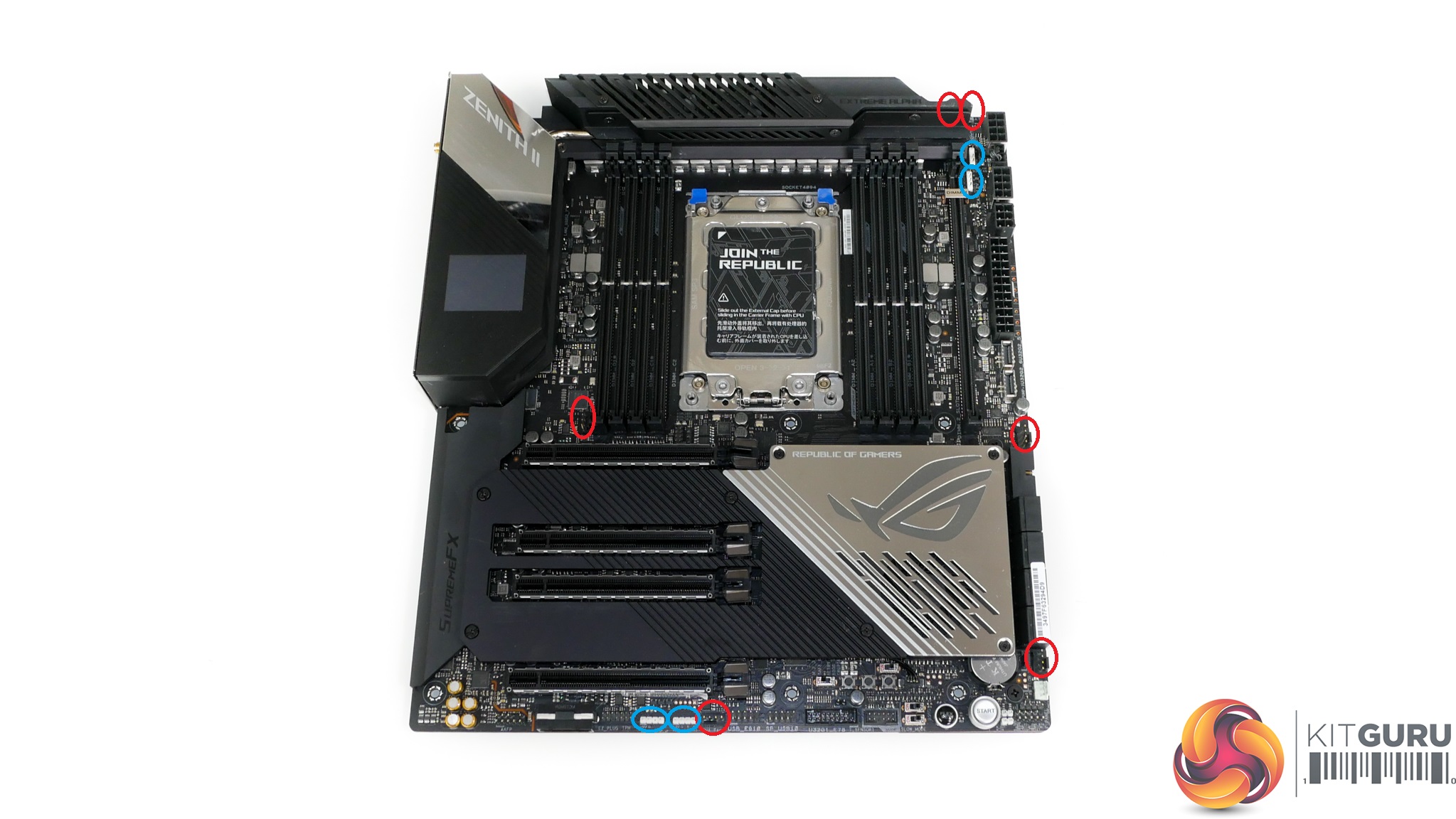 ASUS' inclusion of onboard voltage monitoring points is a feature that I love to see and something that I consider a necessity for an elite level overclocking motherboard. You also get a thermal sensor header in the top-right location which allows you to plug in the thermistor cable and monitor nearby components such as memory modules or VRM heatsink surface temperature, for example.