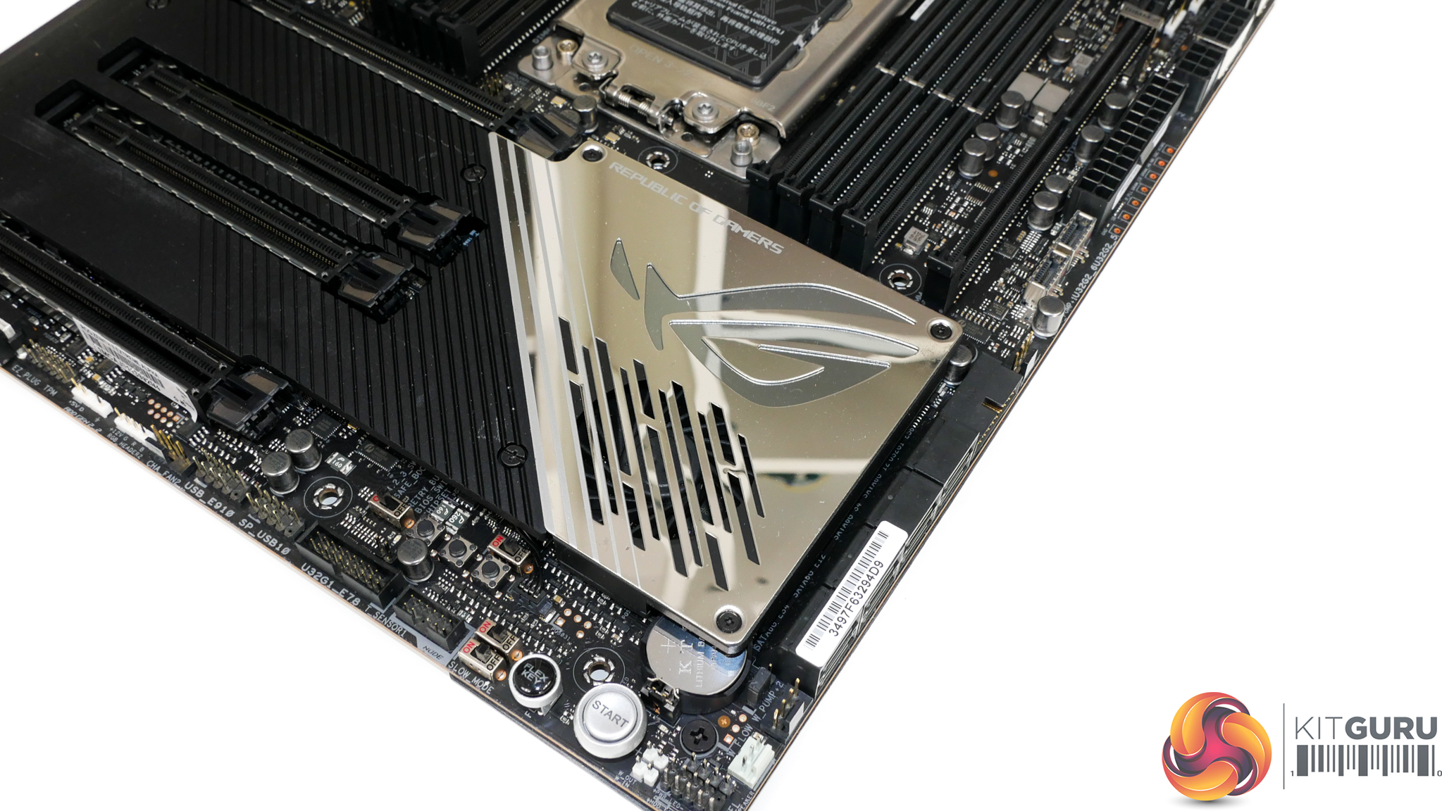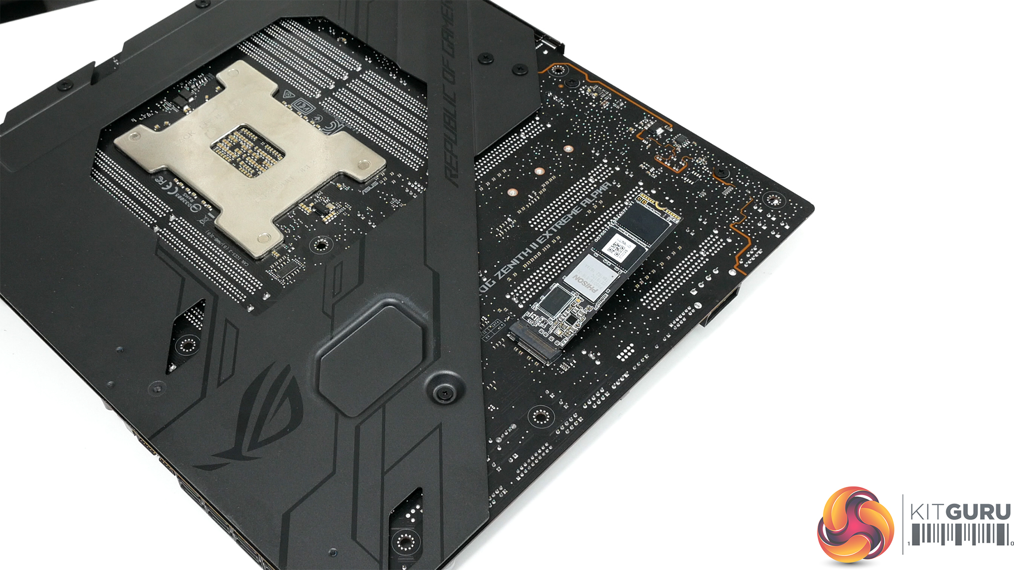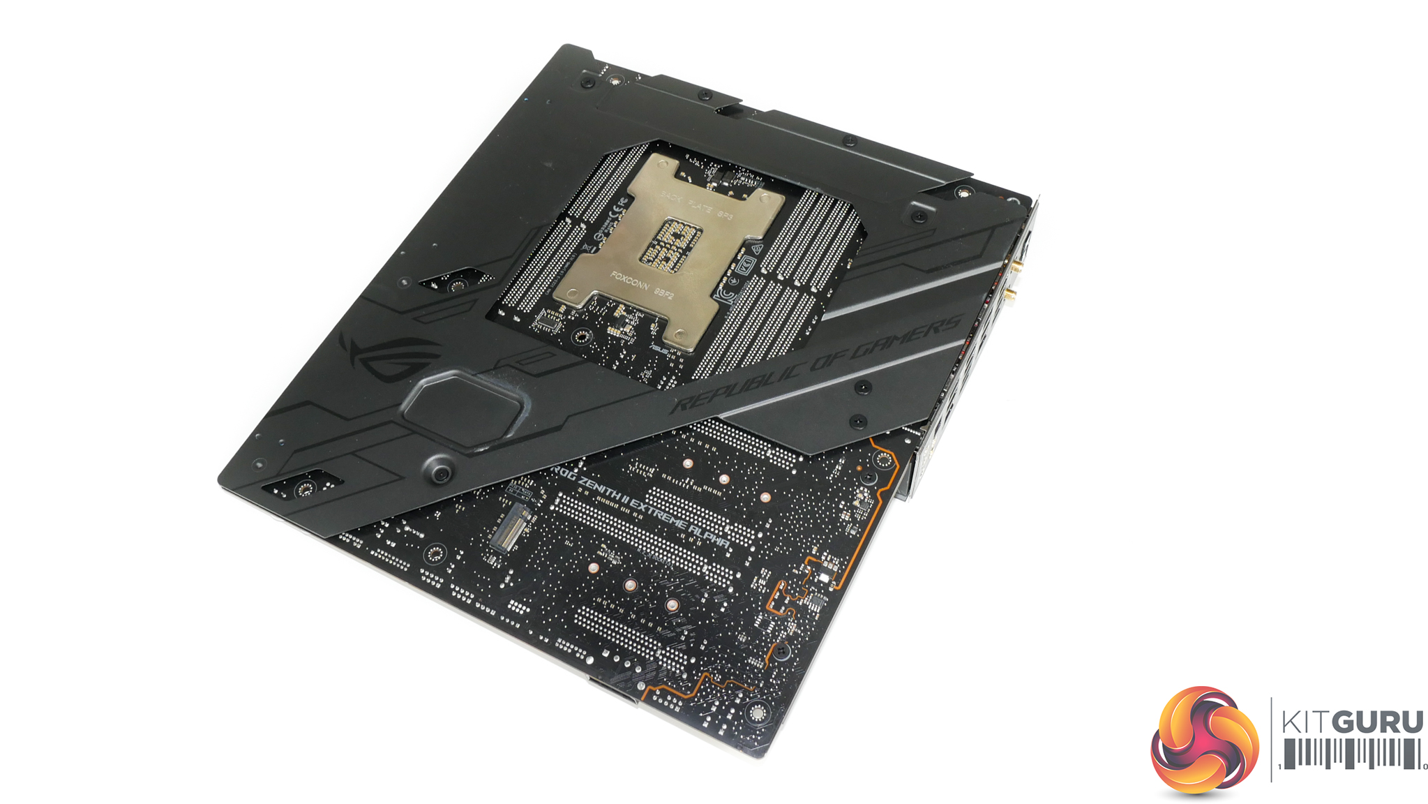 A large shroud covers the bottom half of the motherboard, but it is relatively easy to remove with the board out on a table. The shroud is made from aluminium and features M.2 SSD cooling pads. Adding together all of the heatsink weight provides a motherboard that weighs more than 2kg and feels extremely sturdy.