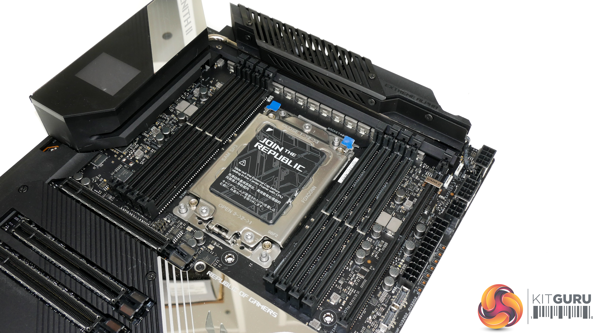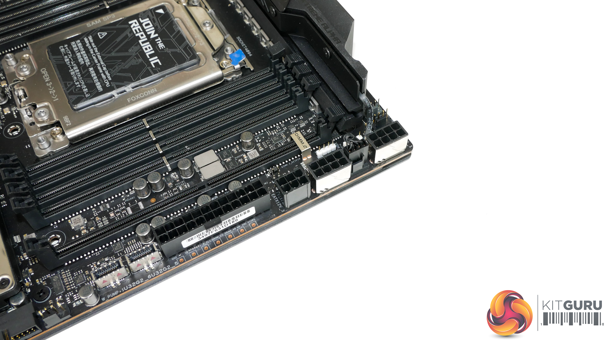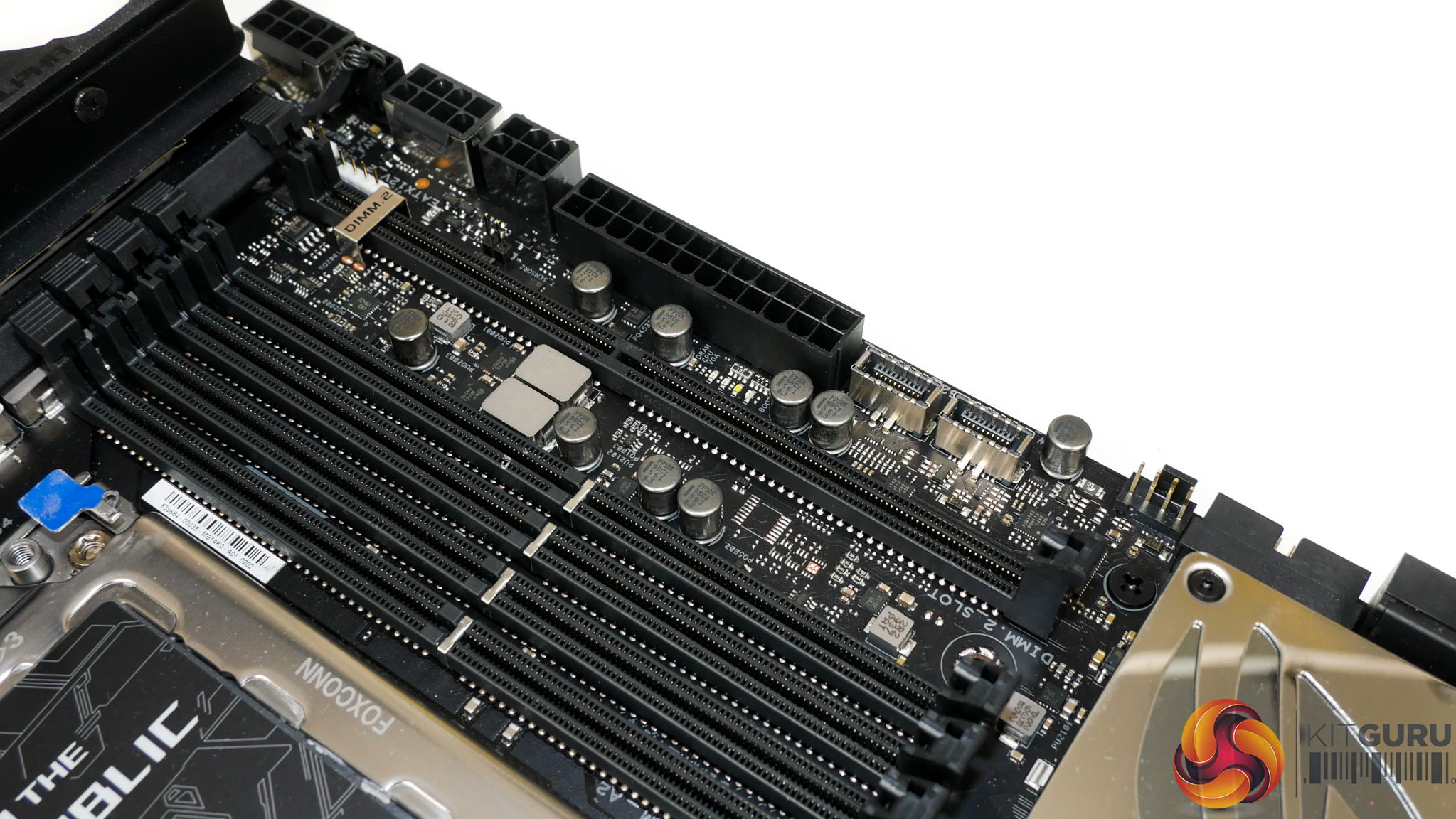 Sat either side of the massive sTRX4 CPU socket is a set of 4-DIMM banks. You get eight DIMM slots in total which allows installation of up to 256GB of DDR4 using standard non-ECC modules. The fastest kits highlighted on ASUS' QVL are DDR4-4600MHz offerings from Corsair and G.SKILL. ECC memory module support is also noted in the QVL.