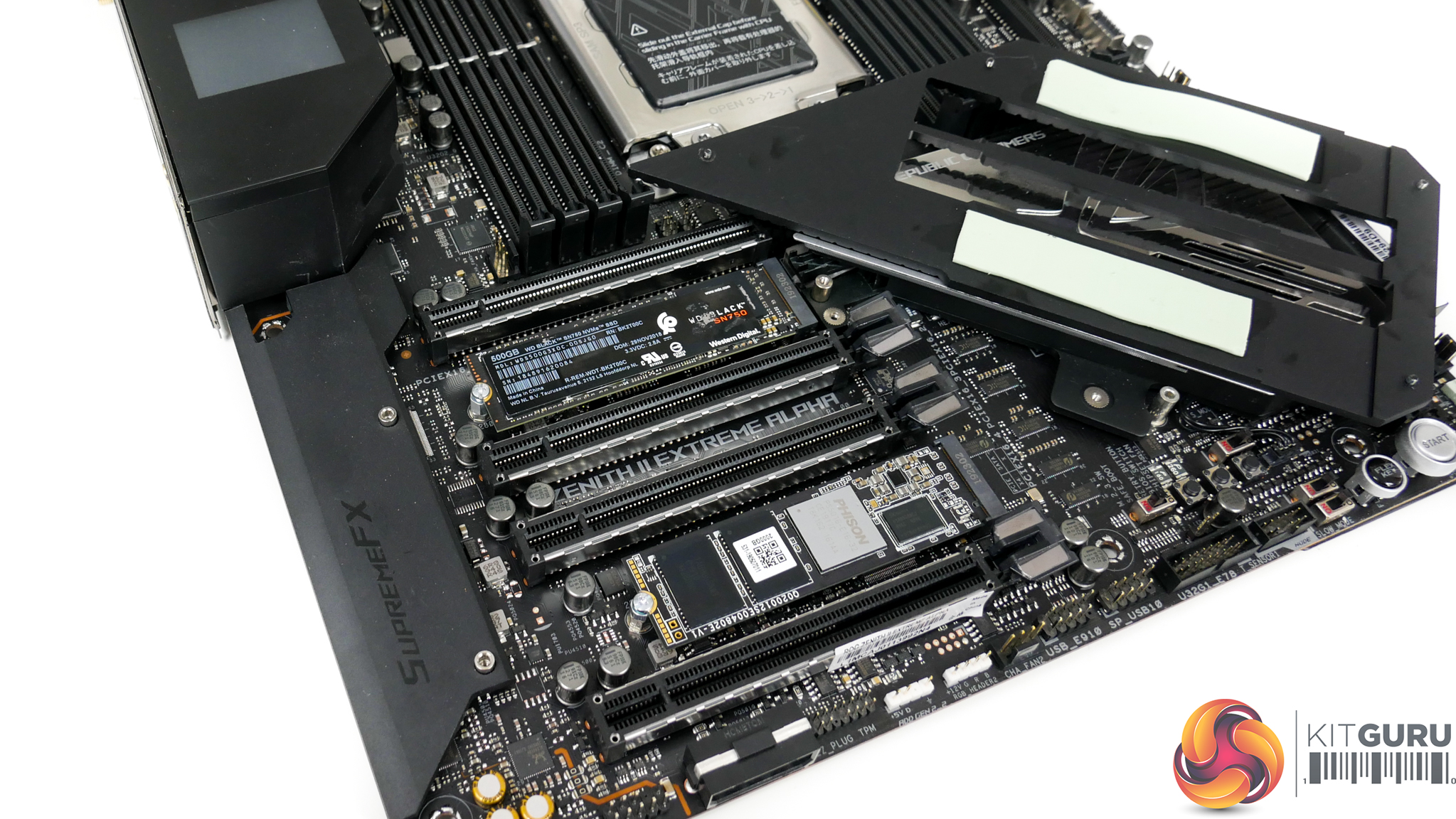 M.2 slot 1 and slot 2 sit beneath the motherboard’s expansion slot area heatsink. They are cooled by thermal pads attached to the sizeable metal plate. Installation with expansion devices already installed will be time consuming as you have to remove the cooling plate.