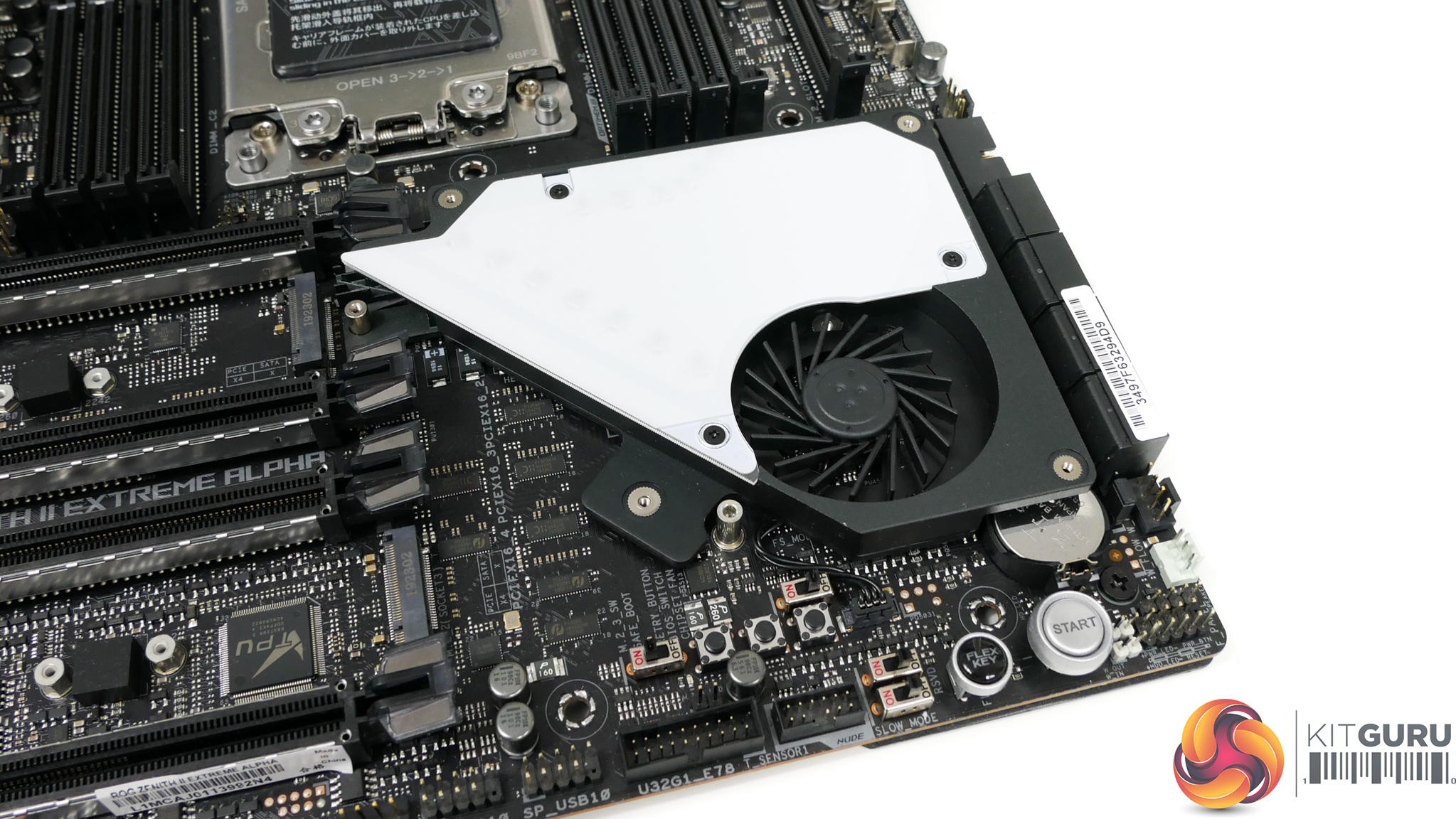 Furthermore, positioning of the chipset fan is preferential as ASUS has made effort to position the blower as far away from a top-slot graphics card as is reasonably possible. This means that the small fan will be able to ingest air from the cool stream driven in by front chassis fans, with a lower amount of interference from the exhaust air exiting a hot graphics card cooler. Of course, that design logic is completely void if a user installs an open venting graphics card in any of the lower slots.
