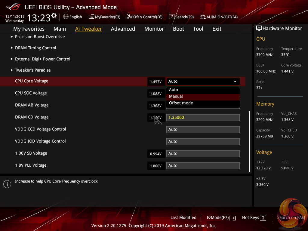 Different voltage operating modes are available for the CPU, allowing the user to adjust an overclock to their own preference. The modes of interest are: Offset, Manual, and Auto.