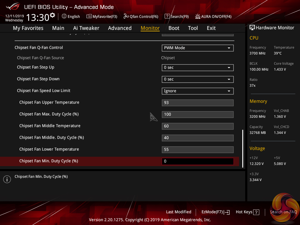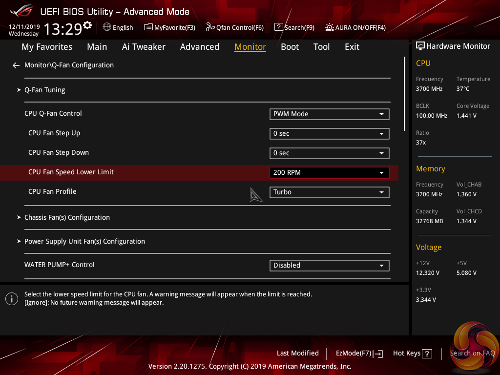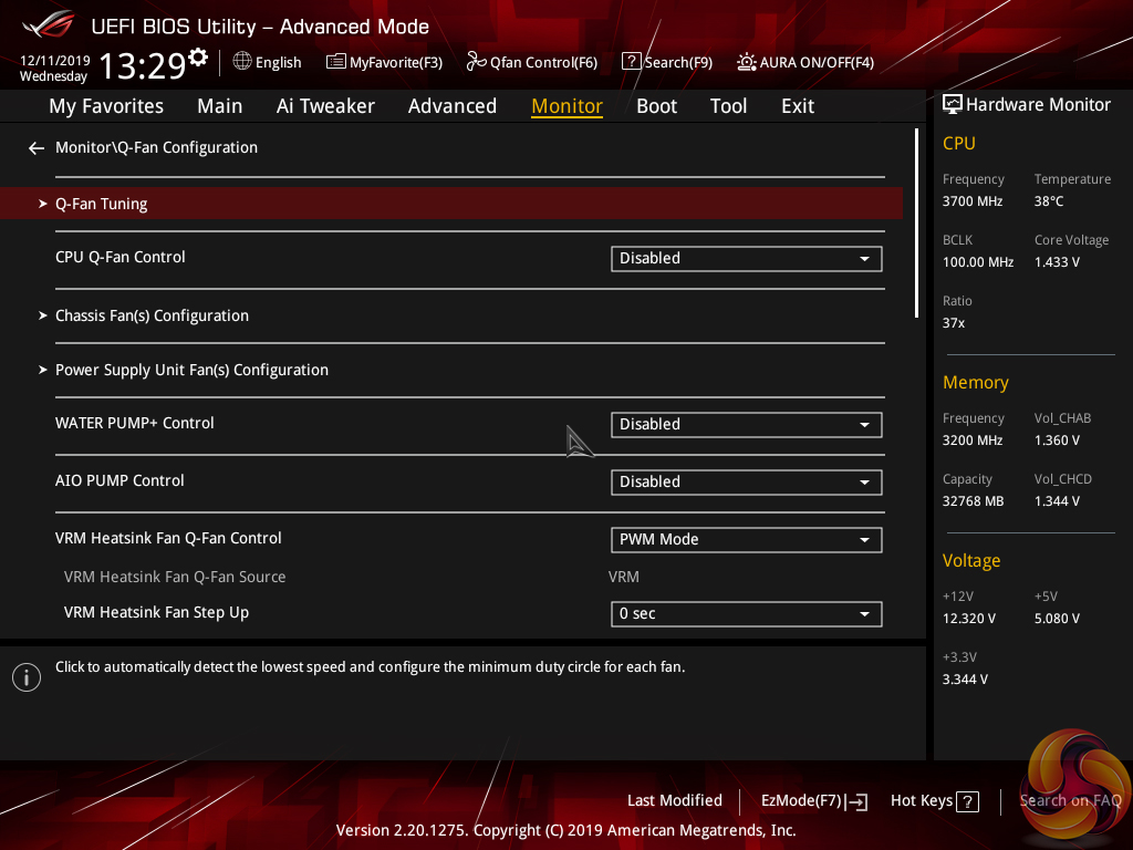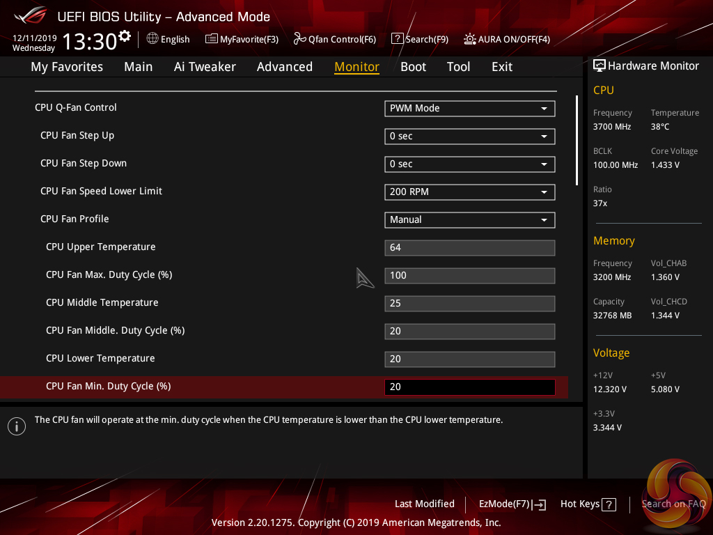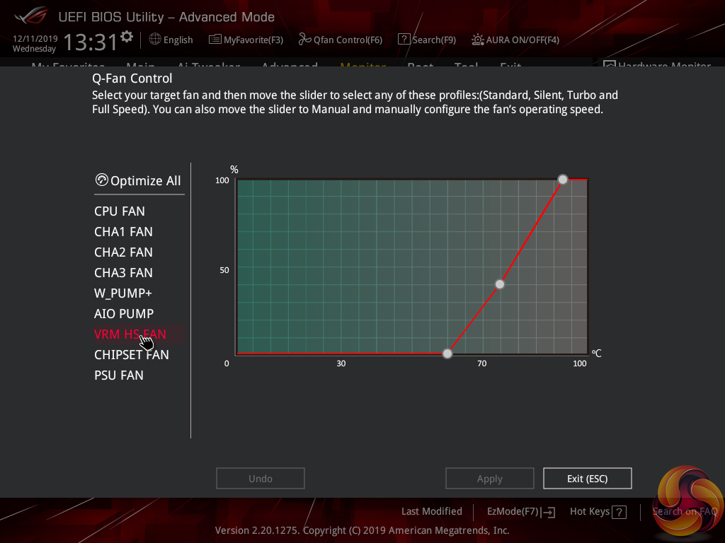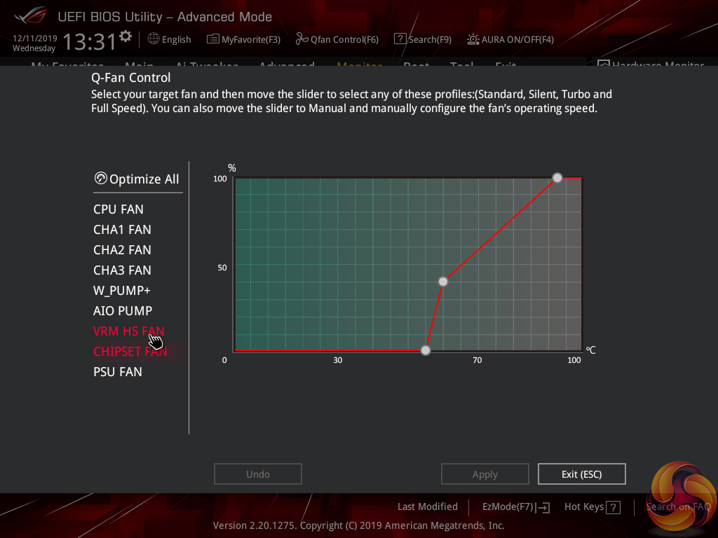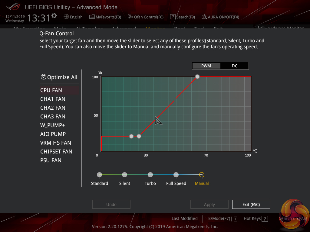 Hitting F6 loads up ASUS’ Q-Fan Control GUI which is a graphical method of adjusting the fan speed curve. All fan headers are given control in Q-Fan by using a 3-point curve. The CPU fan header is given the greatest flexibility as the minimum fan speed it supports is 20%. The non-CPU headers can only go to 60% as their minimum fan speed setting in PWM control mode.