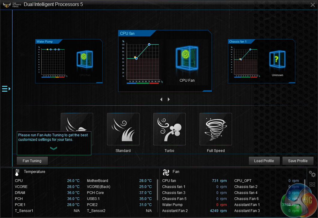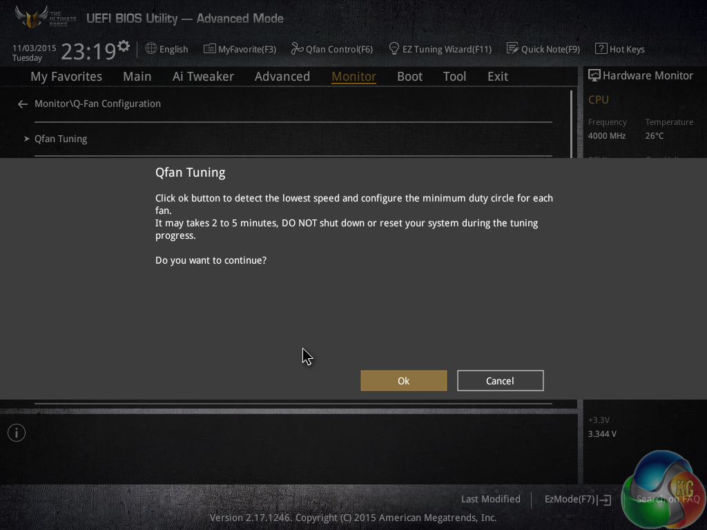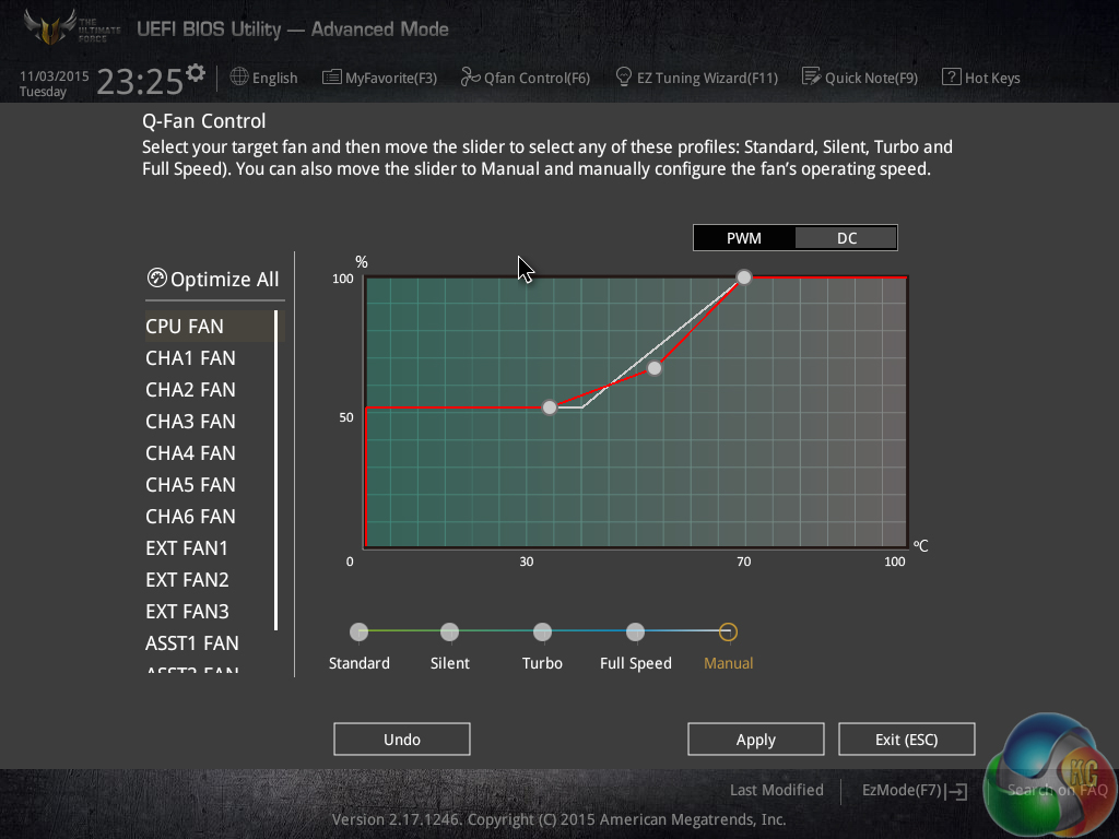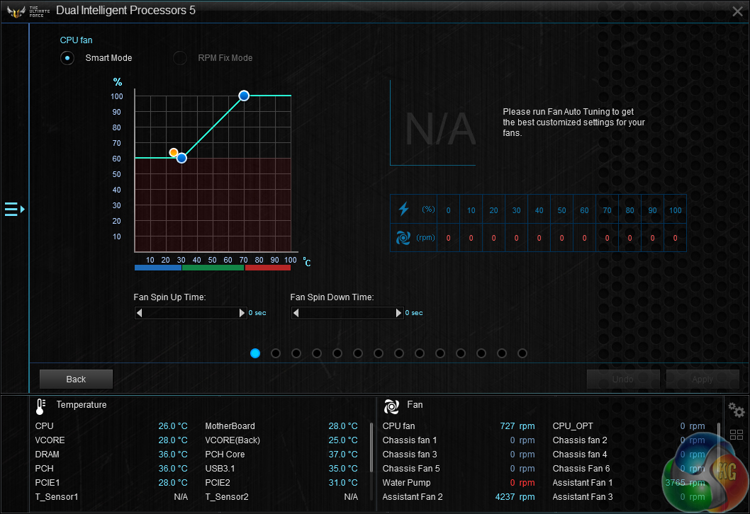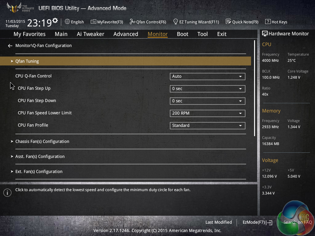 Asus gives the UEFI its usual level of flexibility regarding fan speed tweaking. The Q-Fan Tuning utility gives users a graphical display from which they can adjust speed against temperature settings and there's also an automated configuration tool.
