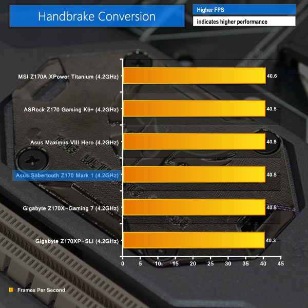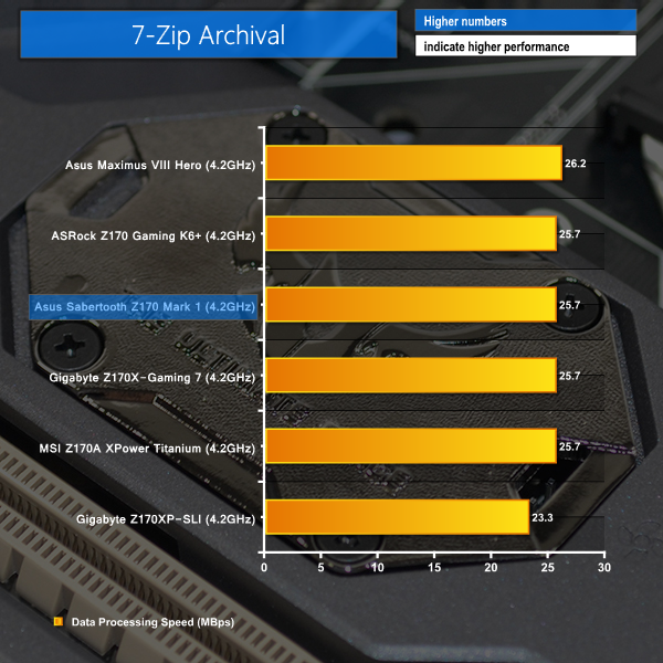 Asus' Sabertooth Z170 Mark 1 shows solid performance in our range of CPU-intensive tests. There's nothing to show that the Sabertooth has ground-breaking performance, but it isn't noticeably trailing its competitors either.