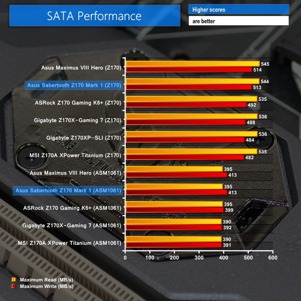 SATA performance is as expected. Asus' Z170-fed ports deliver leading results, while the ASM1061 implementations are also the joint-fastest of all competitors but are significantly slower than Z170 alternatives.