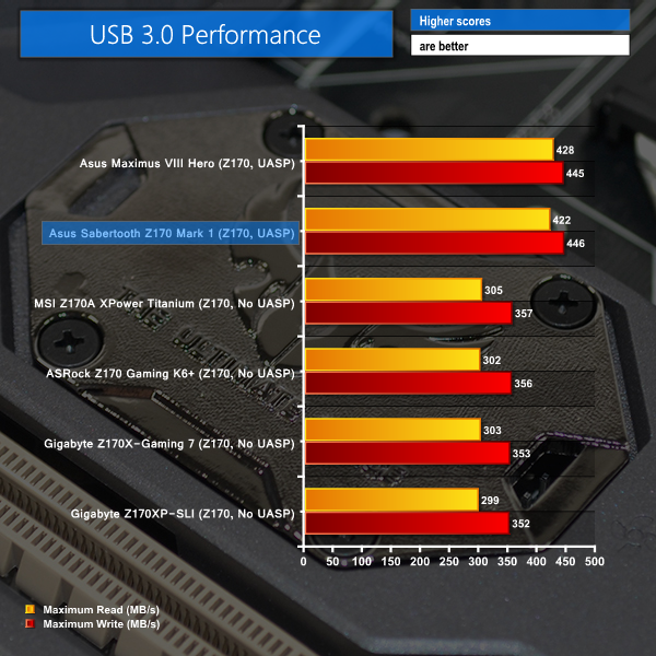 Asus wins the day when it comes to USB 3.0 transfer rates using the Windows 7 OS. This is thanks to Asus' UASP-activating tool that competing manufacturers do not offer.