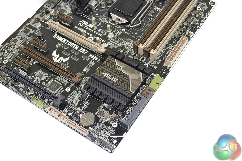 The Sabertooth Z97 Mark 1 does not feature an M.2 connector which is disappointing for users waiting to see which path the storage industry takes before purchasing their new SSD. Lack of PCIe lanes is not the reason for M.2's omission; Gigabyte's Z97X-UD5H-BK re-directs lanes from its SATA Express port to the M.2 connector.