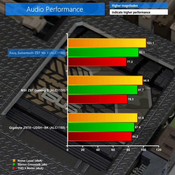 Strong audio performance is displayed by the Sabertooth Z97 Mark 1. The magnitude of the noise level rating, at 103.2 db(A), is particularly impressive. Strong crosstalk performance is likely to be a by-product of the separated audio tracks for either channel.