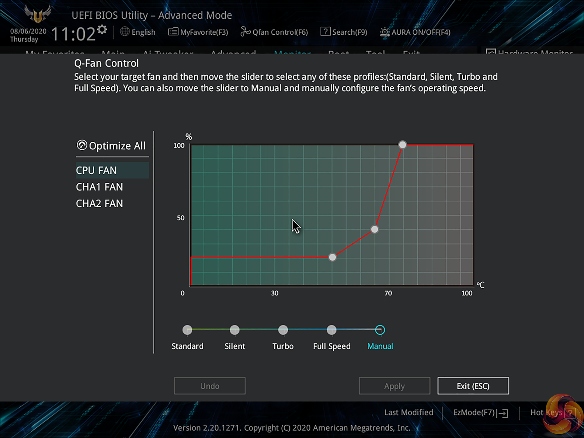 Aside from manual control, you can also do auto fan tuning if you like and if you give the motherboard time to understand the fan dynamics. ASUS’ implementation is a good fan control system overall, but not quite to the level of Gigabyte Smart Fan 5 thanks to that solution typically providing more sensor data. ASUS’ design is, however, better than ASRock’s competition and is certainly comparable against MSI’s solution.