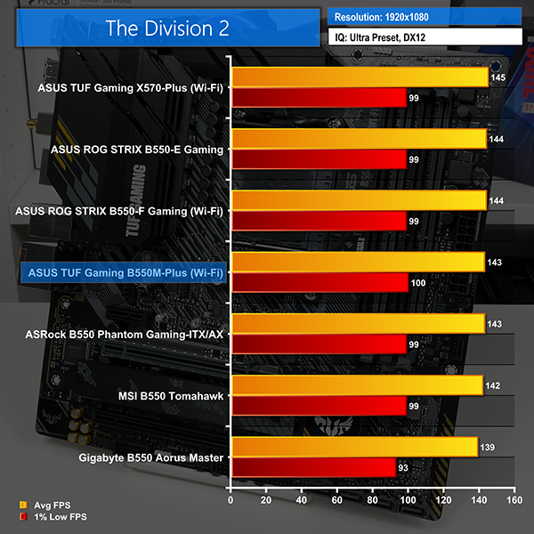 Shadow of the Tomb Raider runs about as fast as we have seen from the ASUS TUF Gaming motherboard, while The Division 2 also throws in excellent FPS results.