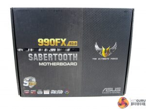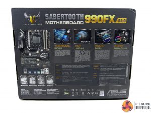 The ASUS TUF Sabertooth 990FX R3.0 ships in dark-coloured packaging that features information pertaining to specifications and noteworthy features on the rear side.