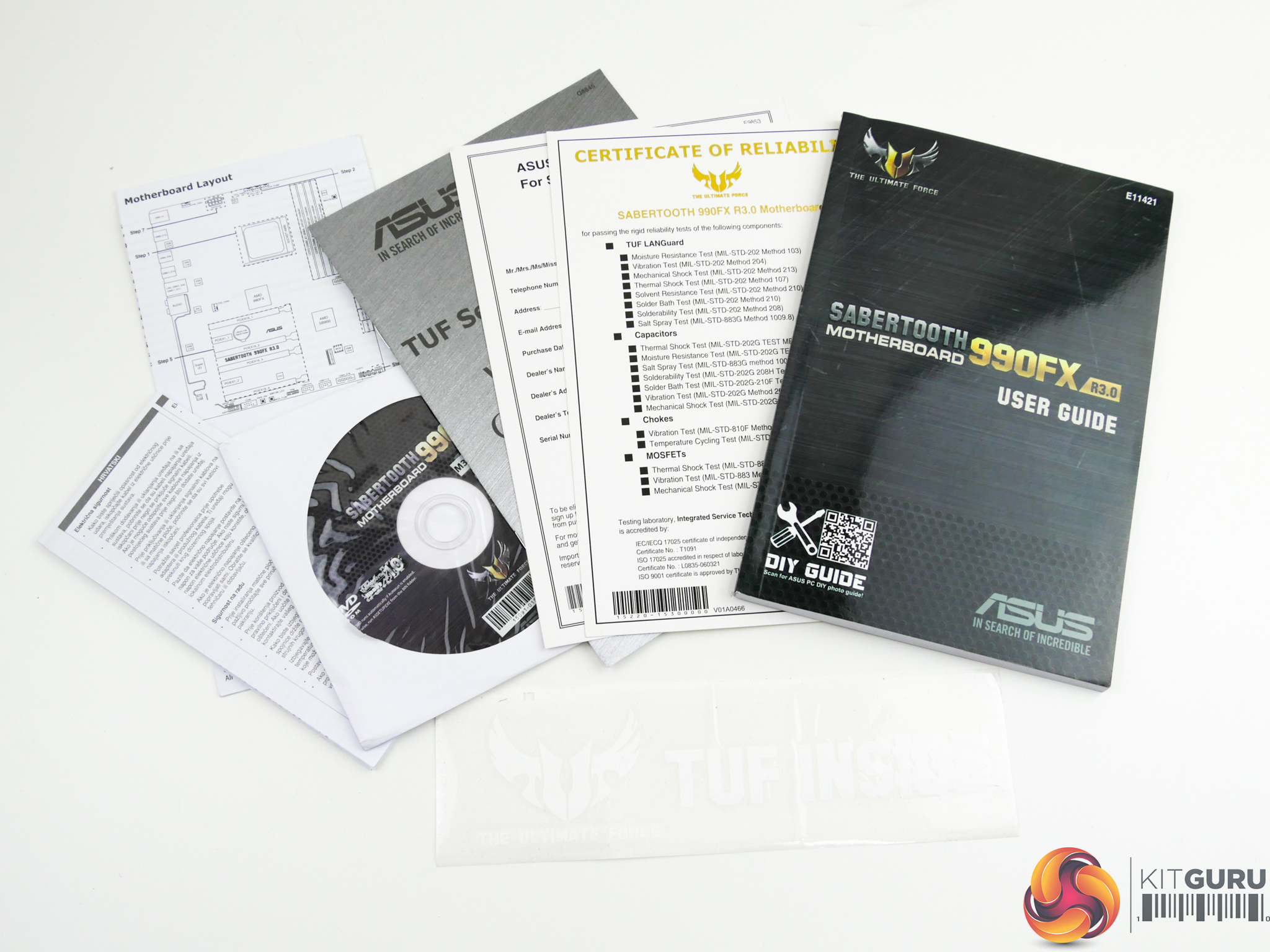 The usual set of documentation is provided alongside a TUF case sticker and a certificate of reliability.