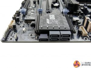 One of the board’s two 5Gbps USB 3.0 internal headers is found below the 24-pin connector. This location is fine but ASUS’ mounting point is slightly inwards of the board’s edge and the orientation is horizontal, making cable management a more challenging task.
