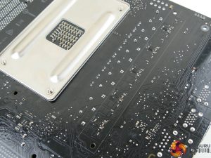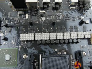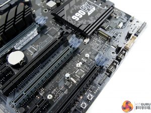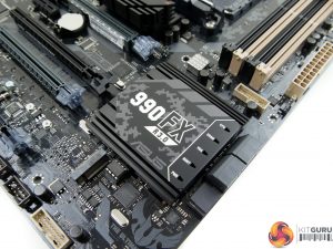 A rear IO cover serves two purposes – blocking out the ugly rear ports and acting as a mounting location for a small rear fan that can be used to cool the VRM components. A heatsink on the board’s rear side cools additional components relating to the power delivery system. A healthy quota of PCIe lanes from the 990FX Northbridge means that a pair of electrical x16 slots are wired alongside two x8 links (one of which is limited to x4 usage).