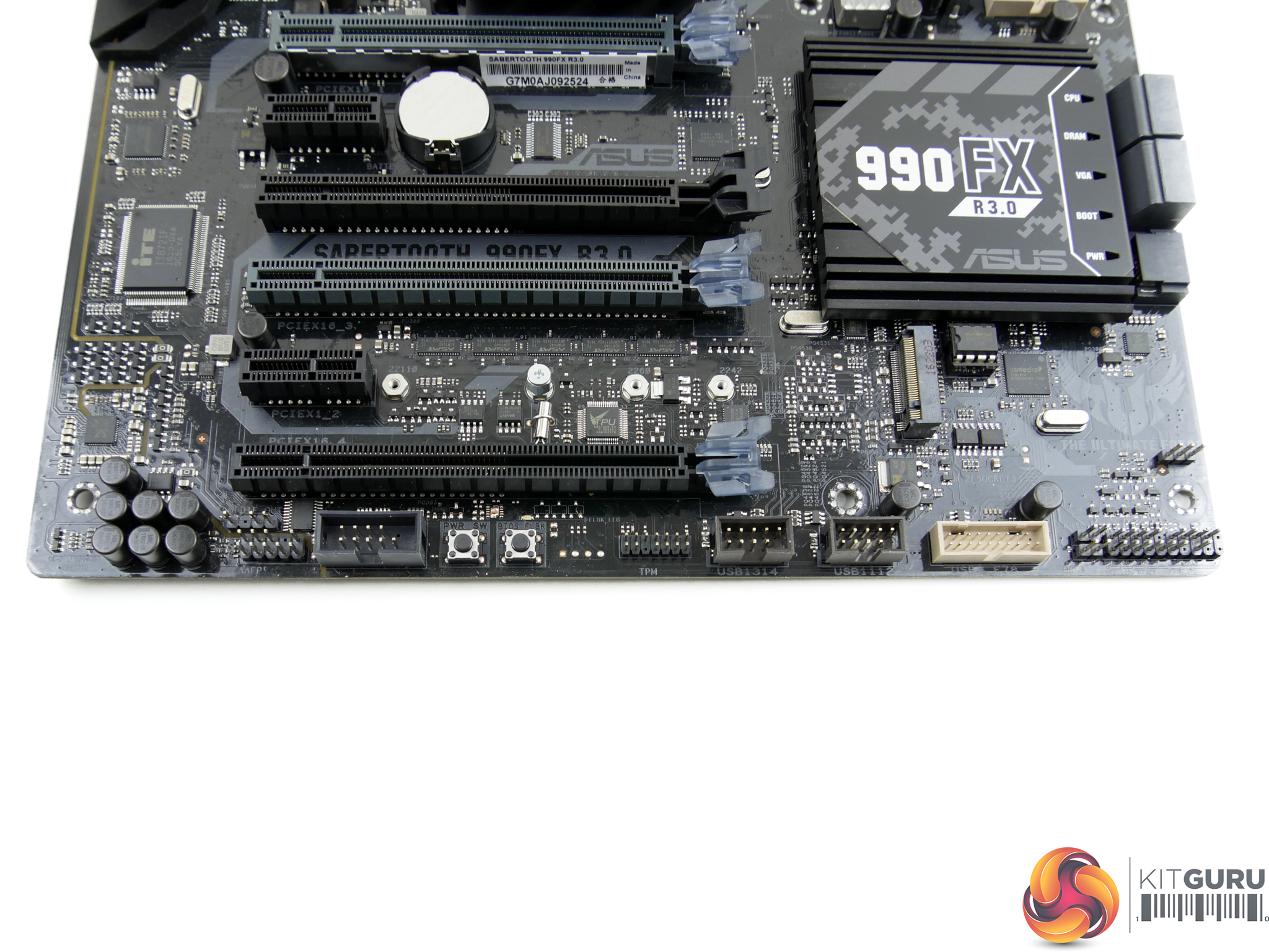 An additional 5Gbps front panel USB 3.0 header is mounted on the bottom of the board, provided by an ASMedia ASM1074 hub chipset that shares its bandwidth with the other internal USB 3.0 header. Power and BIOS Flashback buttons are also found on the bottom edge.