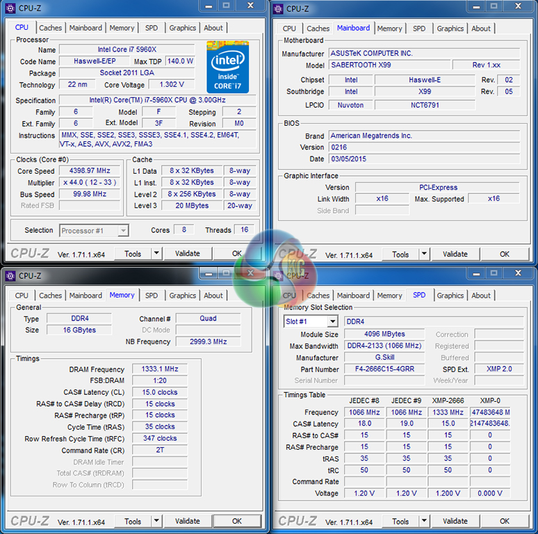 Asus' TUF Sabertooth X99 was able to load the 3GHz XMP settings for our G.Skill Ripjaws4 memory without hesitation. Despite the BCLK increase, CPU core and cache multipliers were automatically adjusted to bring the settings back to their MCT level of 3.5GHz and 3GHz, respectively.