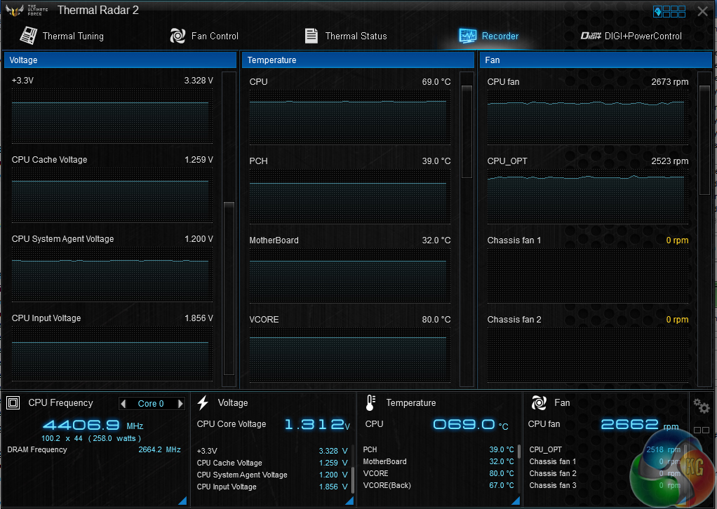Asus' ratio-based automatic overclocking garnered a 3.9GHz CPU frequency (39x100MHz) with 2400MHz DRAM. The CPU voltage level topped out at around 1.17V under load, but dropped when idling to conserve power and reduce thermal loads.
