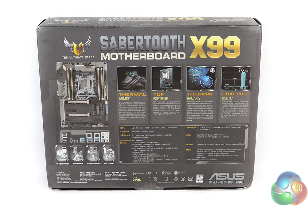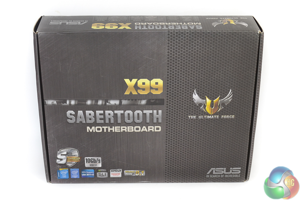 The Asus Sabertooth X99 motherboard ships in packaging typical of the TUF series. A small segment of information, as well as the product name, is found on the front of a grey box.
