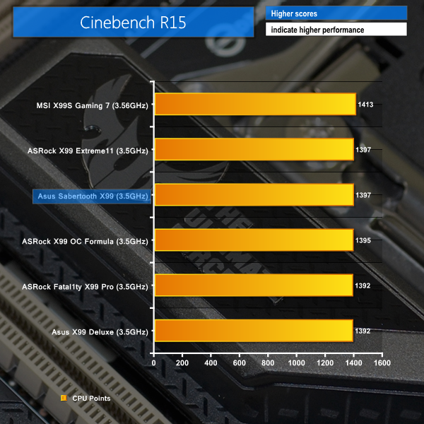 Positive performance results are displayed by the TUF X99 motherboard in Cinebench and our Handbrake conversion test. Both results show the Sabertooth X99 pushing hard to compete for top position.
