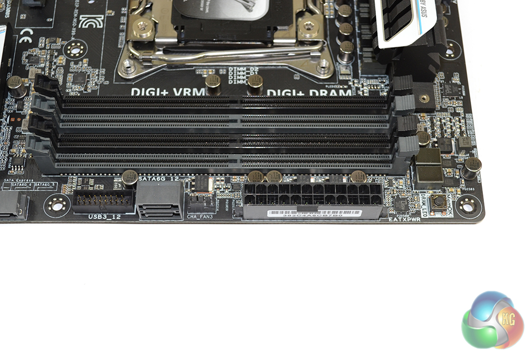 The large LGA 2011-3 CPU socket sits between two pairs of 4-DIMM banks. Asus’ OC Socket adds pins to the standard CPU socket in order to boost voltage delivery potential. The claims of higher CPU clocks can only really be tested with extreme voltage levels and cooling solutions; we have found very little difference between socket types at standard voltages.