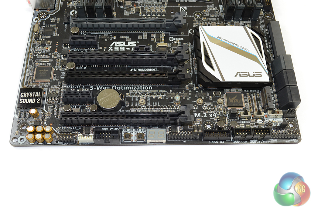 Asus sticks an additional USB 3.0 header along the bottom edge, providing an additional two ports from the X99 chipset. There’s also a convenient two-digit debug LED and power and reset buttons.