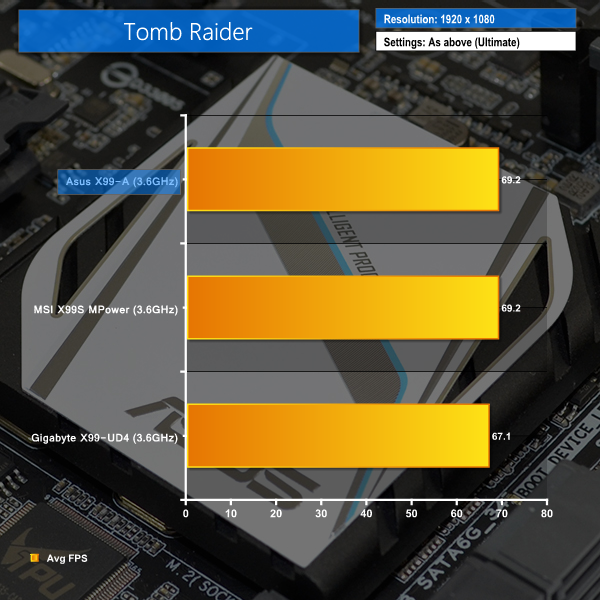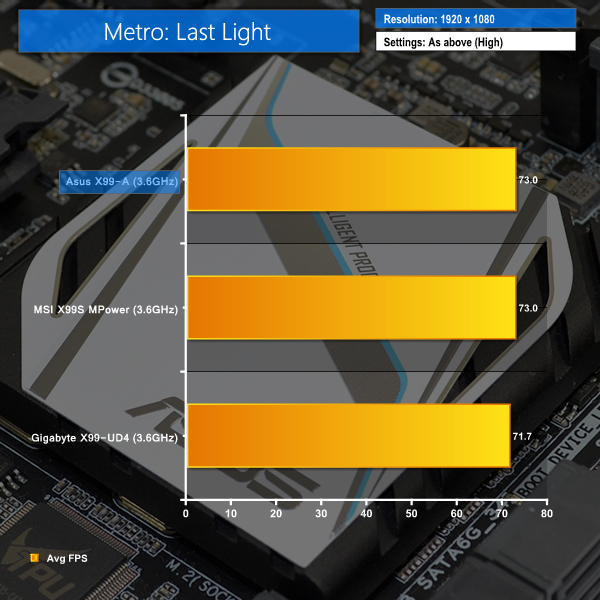 While the Asus and MSI boards are tied for top place in Tomb Raider and Metro: Last Light, Bioshock Infinite shows a 0.2 FPS preference towards the X99-A. That 0.24% performance benefit is low enough to call all gaming results a tie.