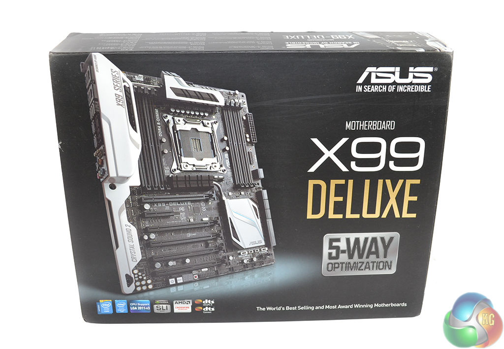 Asus ships the X99 Deluxe in the company's typical style of packaging. An image of the board, its name, and the outline of support for Asus' 5-way optimization engulf the front of the packaging.