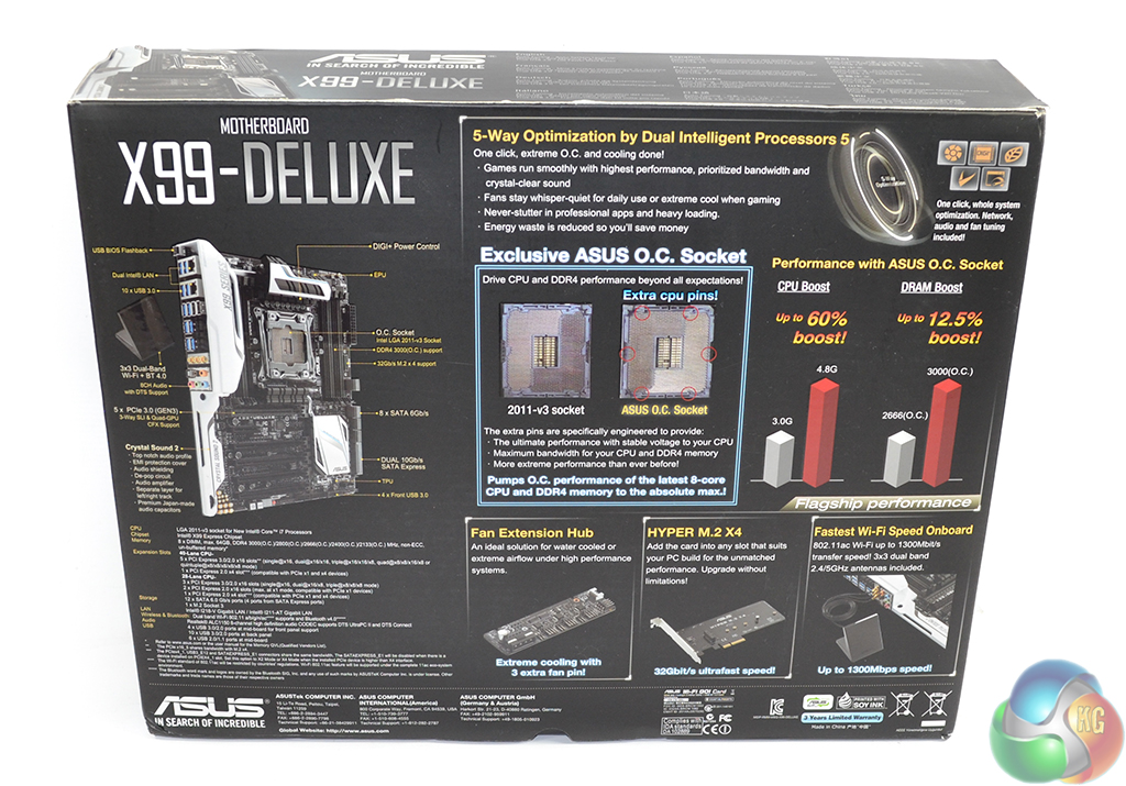 Moving round to the backside reveals an in-depth look at many of the X99 Deluxe's key features. OC Socket steals much of the limelight, and rightly so if Asus' claims hold true.
