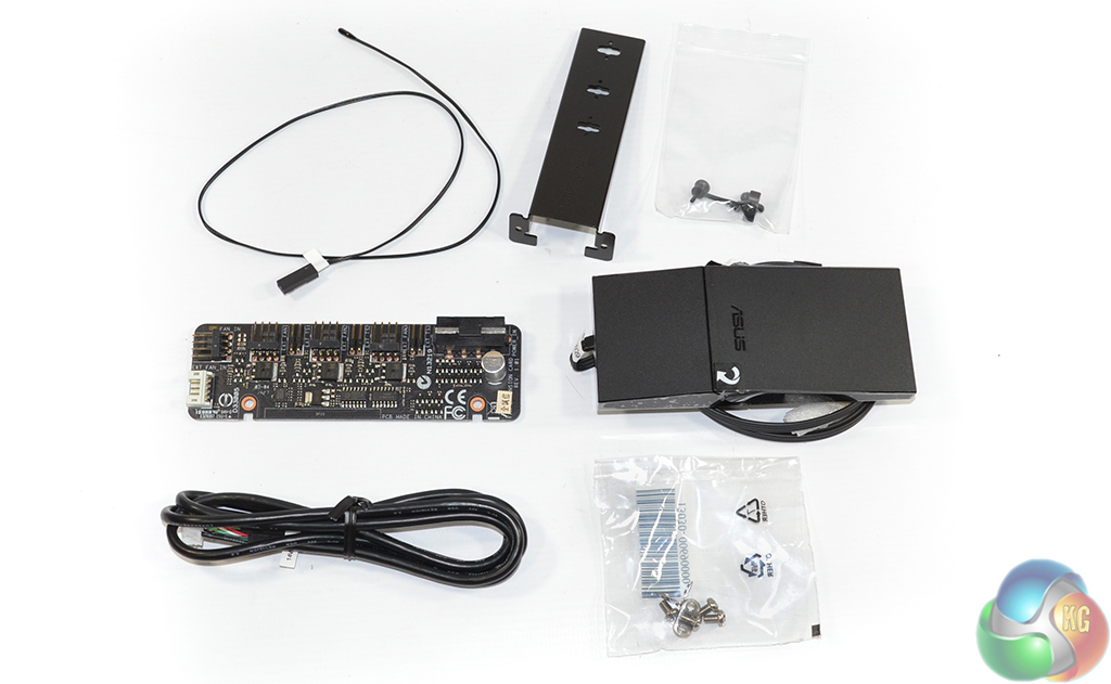 Moving on to the specialty items, Asus includes a variety of unique accessories. On the cooling front, Asus supplies a thermistor cable and fan extension card. The thermistor cable can be deployed in an area of interest to record temperatures, while the Nuvoton NCT7802Y-controlled, powered extension card can manage up to three 4-pin fans from a single PWM input.