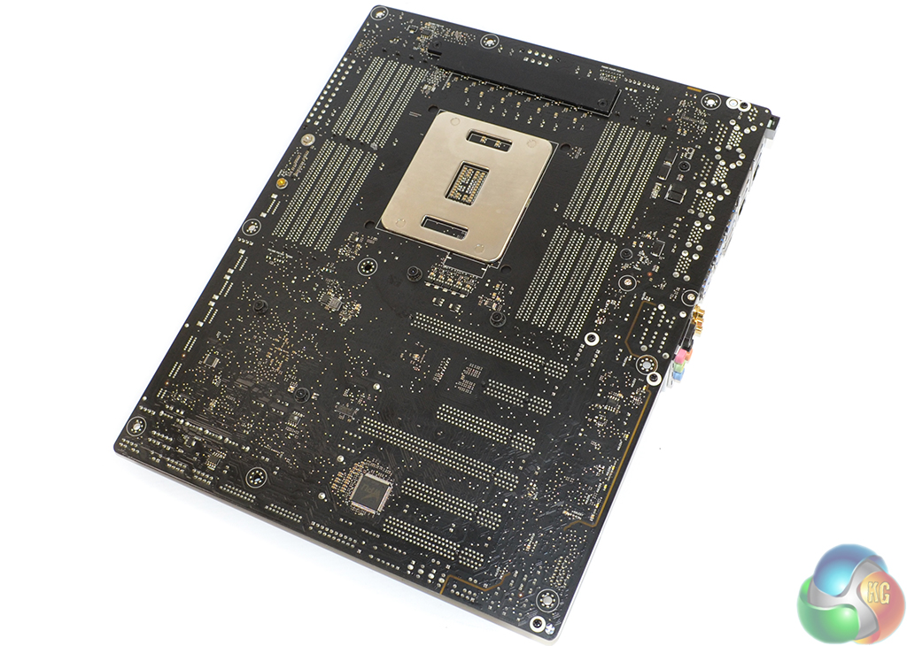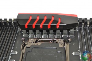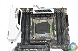 Sat between two pairs of 4-DIMM banks is the sizable LGA 2011-v3 socket. Despite the reference socket design featuring the same number of pins as previous parts, Ivy Bridge-E and Sandy Bridge-E LGA 2011 CPUs are not compatible with X99 motherboards and their new socket due to the use of DDR4 memory. Intel told us that they chose to avoid the possible confusion of a user installing DDR3 memory and a previous-gen processor in a DDR4 motherboard.