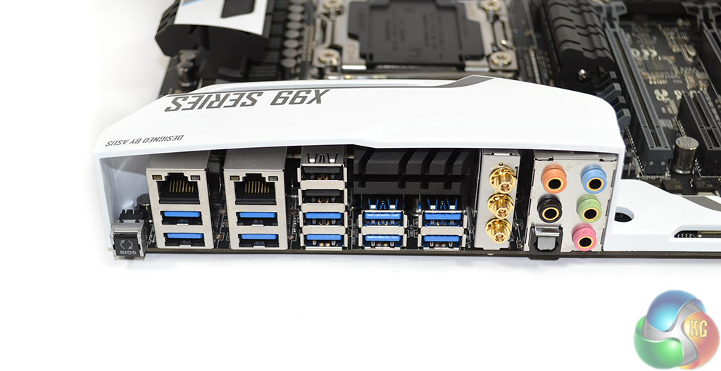 A couple of ASMedia's ASM1074 hubs and one ASM1042AE host controller allow for ten USB 3.0 ports to be placed on the rear IO panel. Two USB 2.0 ports are found, one of which is allocated BIOS Flashback duties in tandem with the specific button.