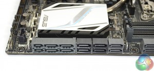 Asus uses eight power phases to feed the CPU and a further four to provide for the eight DIMM slots. The CPU power system is controlled by a Digi+ ‘EPU' ASP1257 digital controller, while a Digi+ ASP1250 chip manages the DRAM power. International Rectifiers PowIRstage IR3553M MOSFETs drive up to 40A of current through each DRAM power phase with a peak efficiency (quoted by International Rectifiers) of 93.2%. The CPU leverages International Rectifiers IR3550M packages which offer a higher current capacity of 60A.