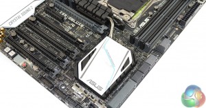 Don't be fooled by the physical provision of five full-length PCIe slots; Asus limits the simultaneous operation to three connections. With a 40-lane CPU, that’s real-world capacity for three-way SLI/CrossFire using dual-slot graphics cards with a x16/x16/x8 + x0 M.2 or x16/x8/x8 + x4 M.2 configuration. The use of a 28-lane CPU would drop all PCIe links down to eight lanes and keep bandwidth for the x4 M.2 connector.