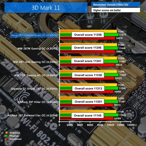 Overclocking the 4770K processor to 4.5GHz allows Asus's Z87-Deluxe/Quad to take a narrow performance lead in the 3DMark 11 benchmark.