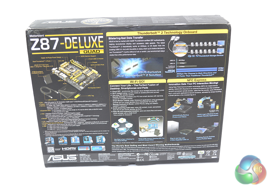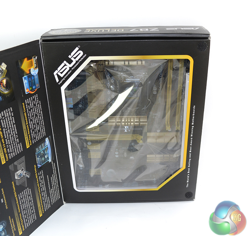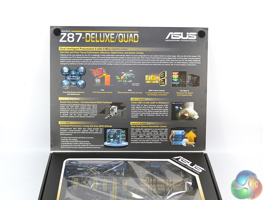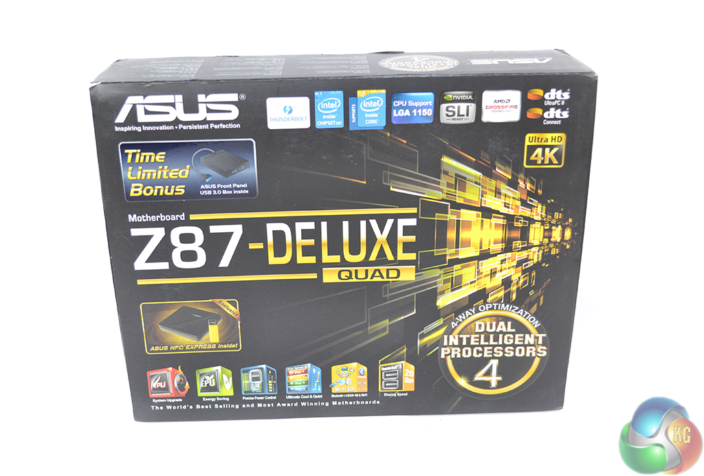 Asus ships the Z87-Deluxe/Quad in the company's typical packaging. A black box features information and promotional material.