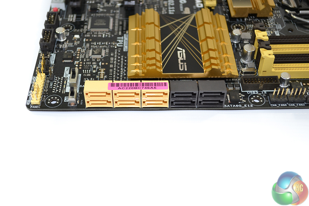 Ten SATA 6Gbps ports are found on the Z87-Deluxe/Quad motherboard. The six gold-coloured ports operate directly from the Z87 PCH, while the four black connectors are provided by two ASMedia ASM1061 chipsets.