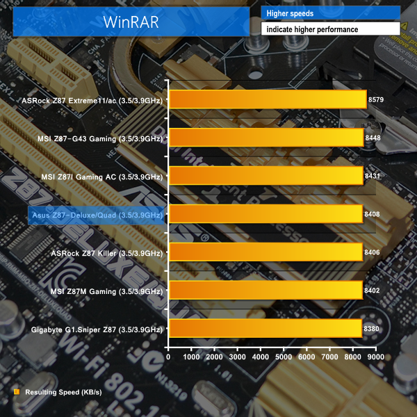 WinRAR’s built in benchmark and hardware test can help us outline the performance differentials between each motherboard.