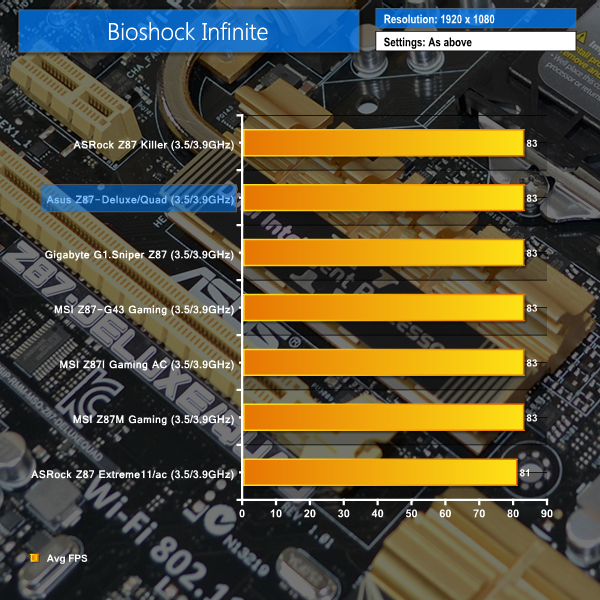 Gaming performance from the Asus Z87-Deluxe/Quad is solid. The motherboard managed to muster up a few extra frames over some of its Z87 counterparts. Asus's board also managed to vastly outperform the similarly professional user-orientated ASRock Z87 Extreme11/ac motherboard in gaming tasks.