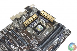 Looking at the CPU power delivery section, it is easy to see where Asus issues a drive to cut costs. An eight phase power delivery system is used on the Z97-A, though we don't see the 10K solid black caps or BlackWing chokes that may be found on higher-priced boards in the series.