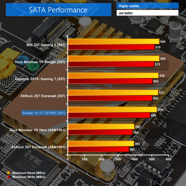 Performance of the Z97-fed SATA 6Gbps is roughly where we expect it to be, minus some age-induced speed degradation on our Kingston SSD.