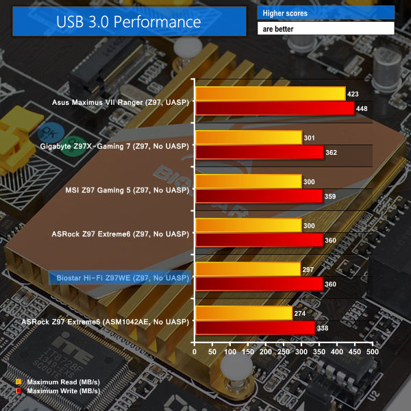 USB 3.0 performance is also typical for a Z97-powered set of ports that are not accompanied by UASP-activating software.