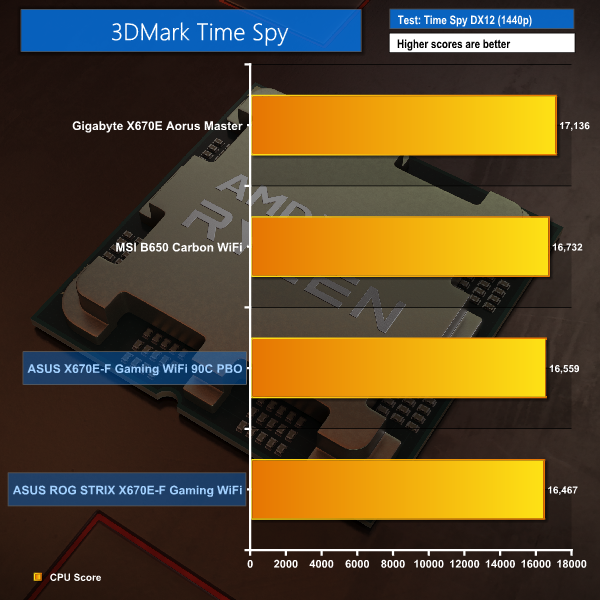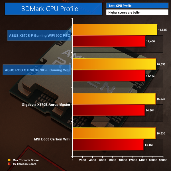 If you care about 3DMark’s tests, the ASUS X670E board delivers what you want to see performance-wise in the CPU Profile test. Though it is a little behind the pack for the Time Spy numbers.